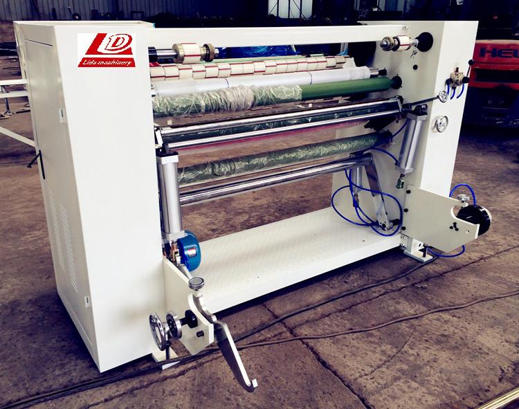This LD-1300B adhesive tape cutting machine includes four parts: Slitting machine, core loader, core cutter and rewinder.